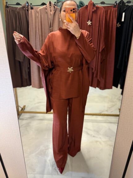 Takım; tunik, pantolon ve angora dokulu yelekten oluşmaktadır. Yelek üzerinde kullanılan dokulu ve yumuşak angora görünümlü kumaş, takıma şık bir hava katarken tunik ve pantolonun dökümlü yapısı gün boyu rahat hareket imkânı sağlar.