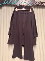 Pantolon beli lastiklidir ve vücuda uyumlu kalıbı sayesinde konforlu bir kullanım sunar. Üçlü kombin olması sebebiyle kombin derdi olmadan zahmetsiz şıklık sağlar.