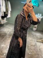 Kruvaze yaka ve kemer detayı ile vücut formunu zarif şekilde ortaya çıkarır.