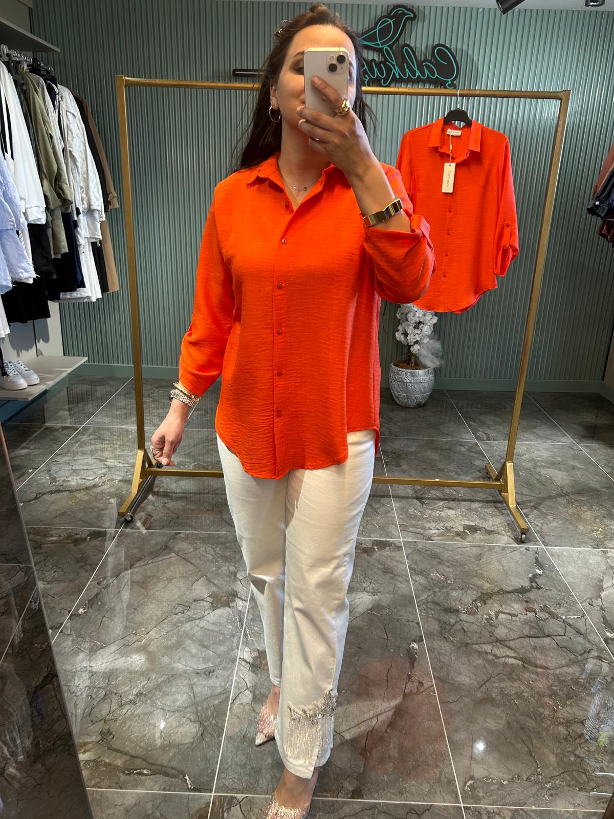 - KETEN DOKULU GÖMLEK ORANJ Enerjisiyle göz kamaştıran bir parça! Doğal dokusu, dökümlü duruşu ve rahat kesimiyle bu gömlek hem günlük stilinizin yıldızı hem de ferah bir yaz parçası olmaya aday.