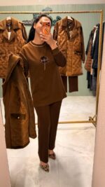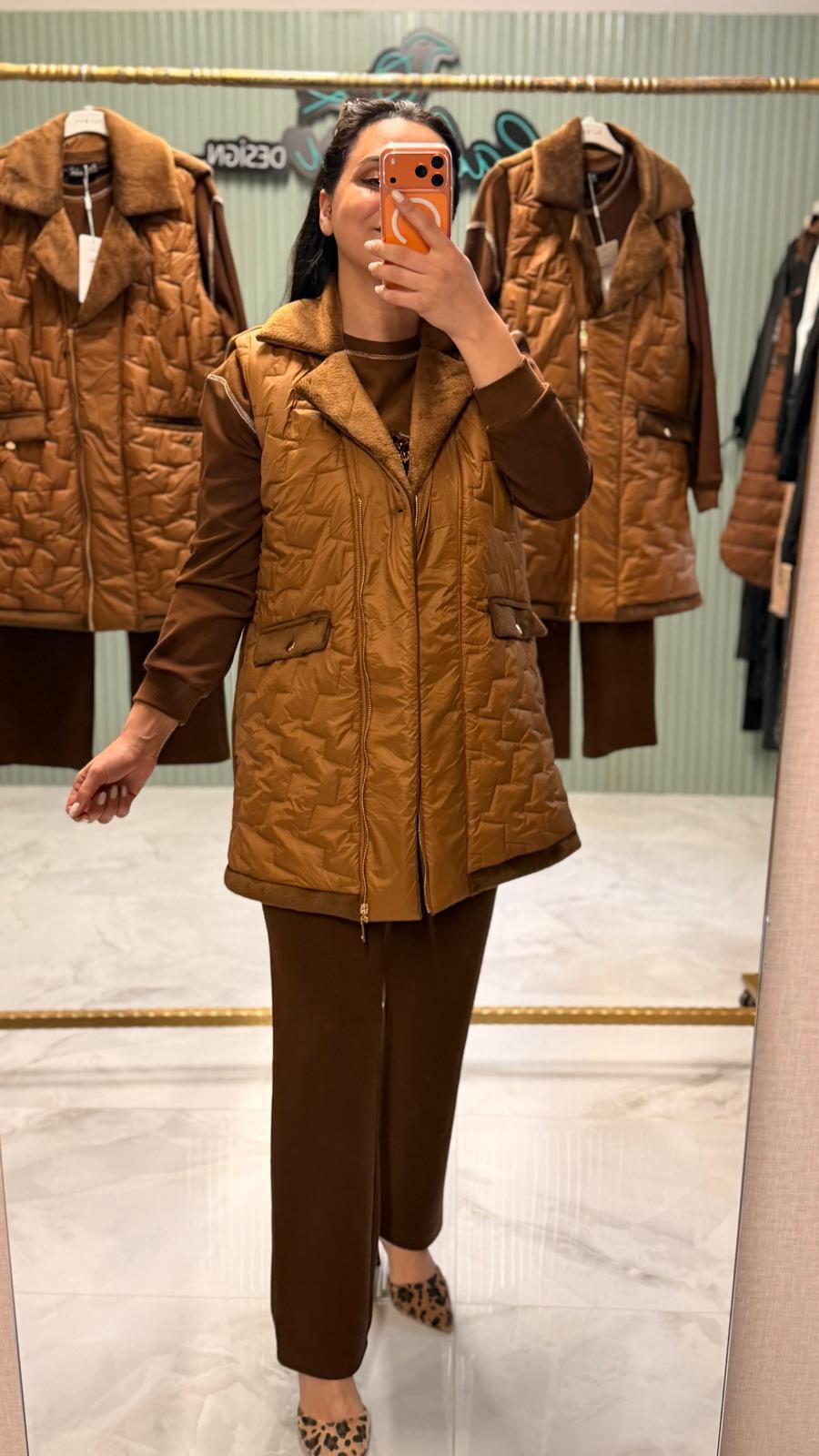 İçindeki tunik ve pantolon rahat kesimiyle gün boyu konfor sağlarken, kapitone yelek kombine modern ve şık bir hava katar.