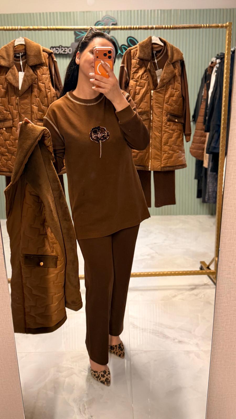 Günlük şıklığı ve konforu bir arada sunan bu özel 3’lü takım, modal kumaşın yumuşak dokusu ve kapitone yelek detayı ile öne çıkar.