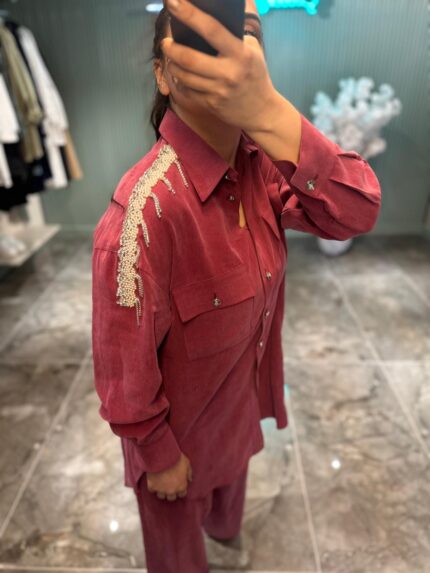 Ceket: Düğme detaylı, kuşak kemerli ve önü açık tasarımıyla feminen bir duruş sergiliyor. Yakasındaki el işçiliği siyah taş işlemeleri ve etek ucundaki dantel detayı, takıma sofistike bir hava katıyor.