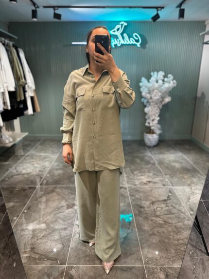 • Pantolon: Bol paça, yüksek bel ve lastikli beliyle hem rahat hem de şık bir görünüm sağlıyor.