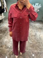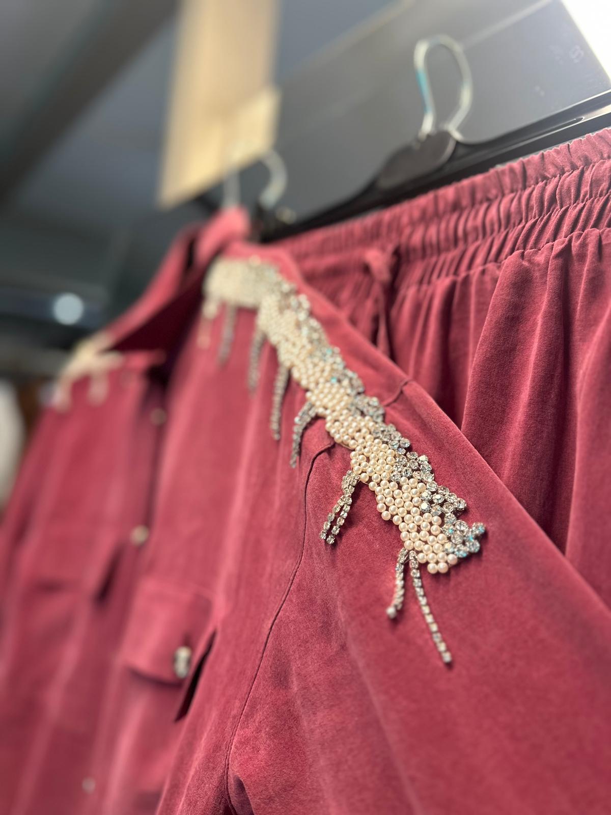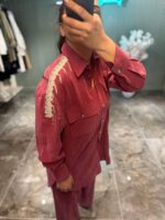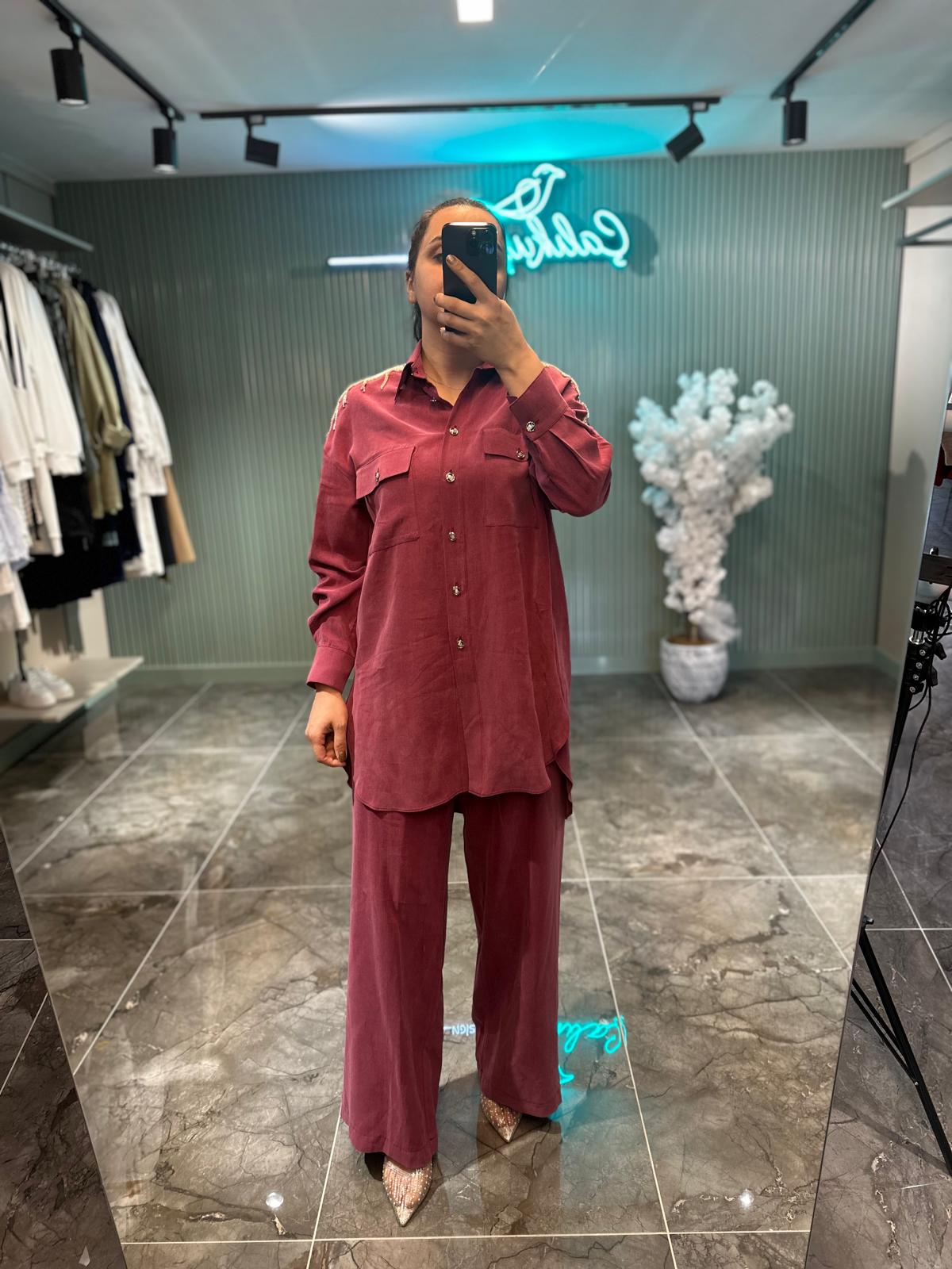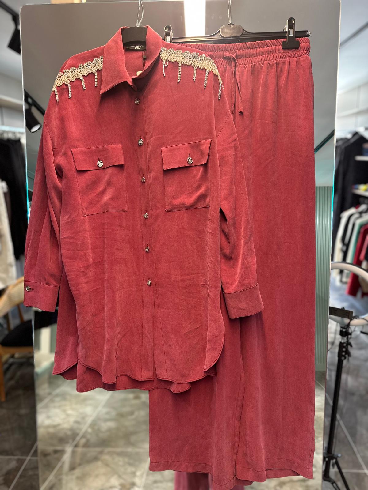 Omuz kısmındaki inci ve taş işlemeleri, klasik tensel kumaşa modern ve lüks bir hava katarken, gömleğin düğme detayları ve cep tasarımı kullanışlılığı ön plana çıkarıyor. Pantolonun beli lastikli yapısıyla gün boyu rahatlık sunar. - Gündüzden geceye kolayca uyarlanabilecek bu takım; ister topuklu, ister spor ayakkabılarla kombinlenebilir.
