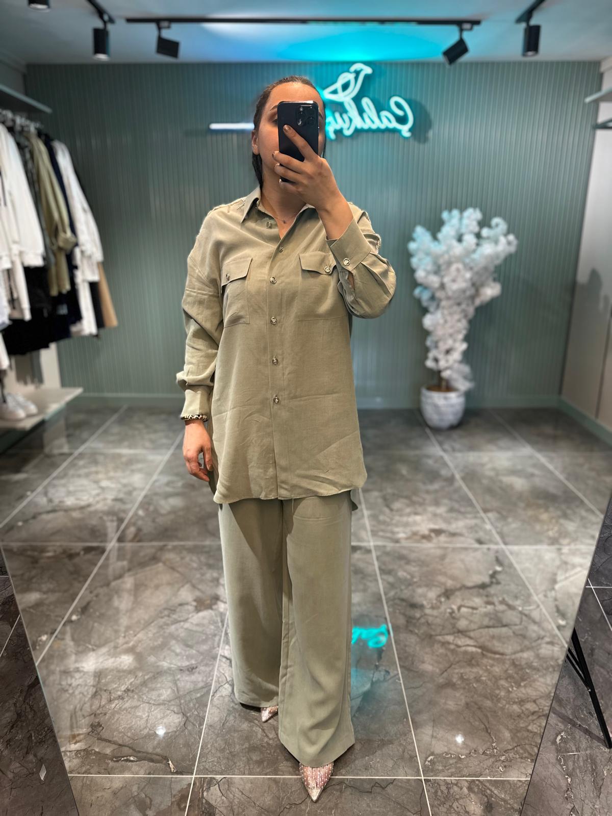 Cepli gömlek tasarımı ve beli lastikli pantolon yapısıyla hem şık hem rahat bir alternatif sunar. - İster günlük stilinize zarif bir dokunuş, ister özel günlerde rahat bir şıklık arayın, bu takımla her ortama hazırsınız!