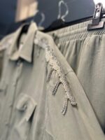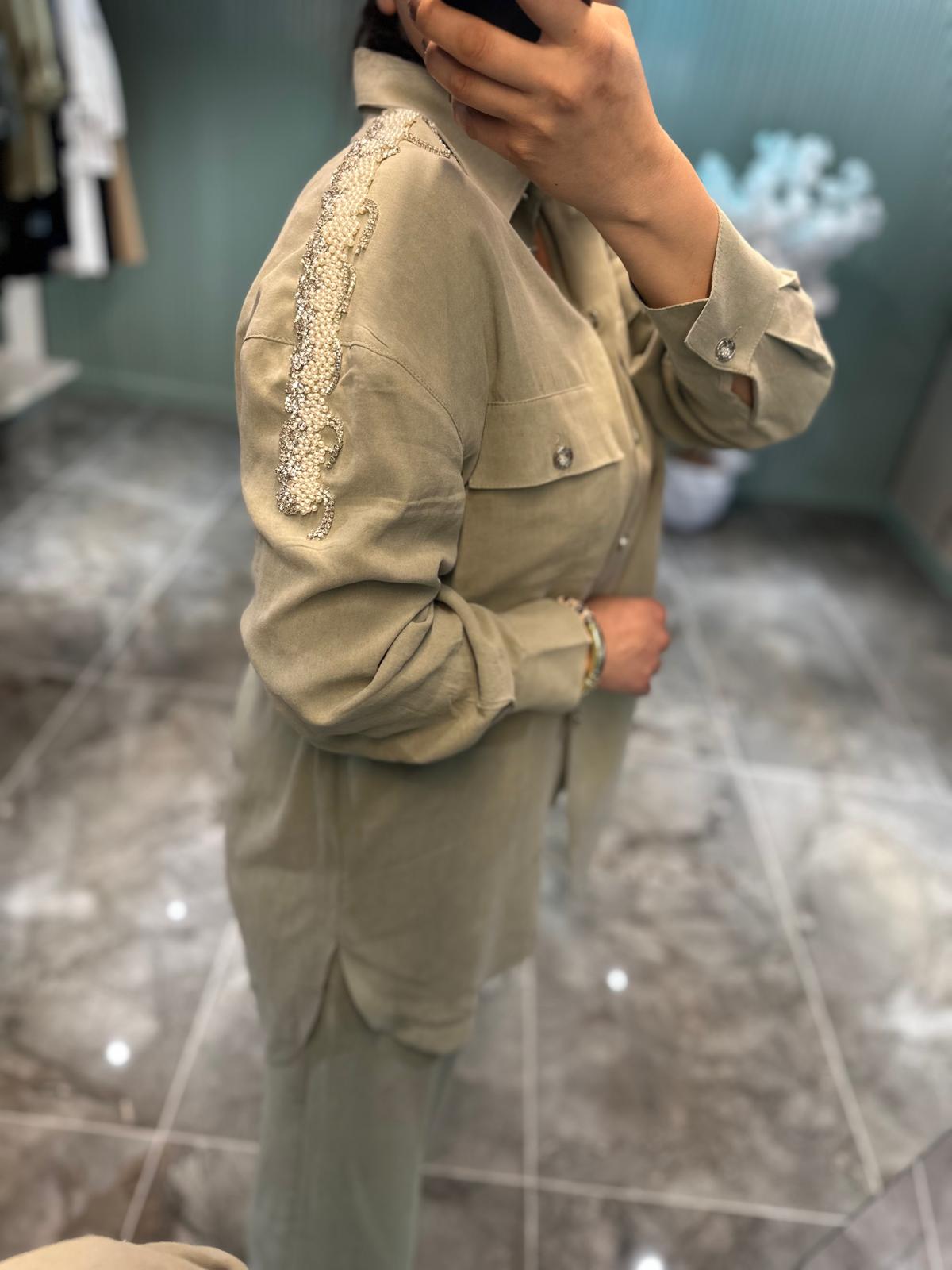 Sade ama fark edilir bir şıklık arayanların favorisi olacak bu takım, omuzlardaki inci ve taş detaylarıyla zarafeti öne çıkarıyor. Tensel dokusunun yumuşaklığı ile gün boyu konfor sunarken, detaylardaki ışıltı kombinlerinize sofistike bir hava katıyor.