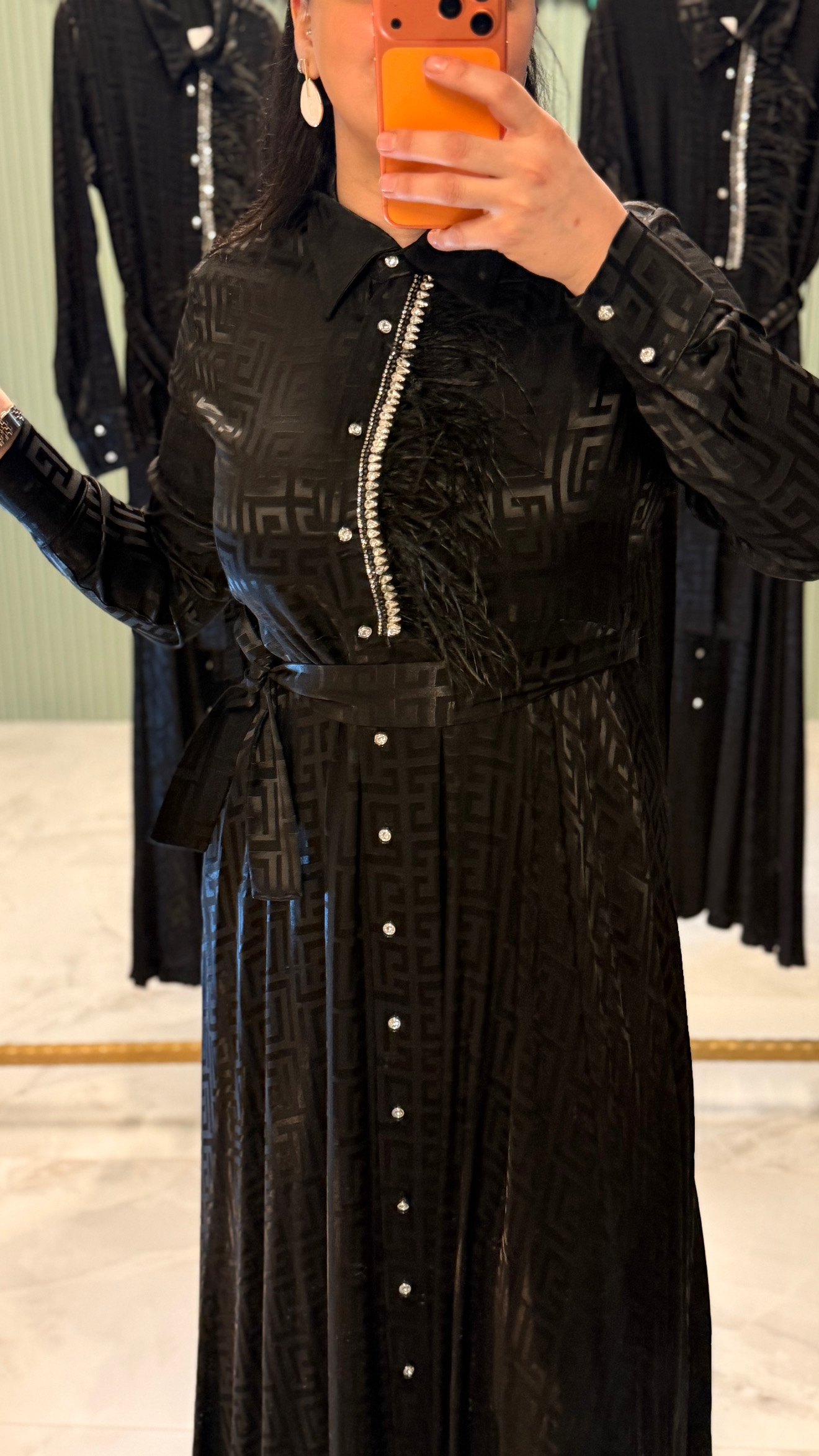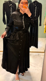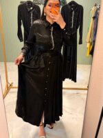 Özel dokuma jakar kumaşı ve ön kısmındaki zarif taş detayları ile şıklığı ön plana çıkaran bu elbise, hem günlük kullanım hem de özel günler için ideal bir tercihtir.