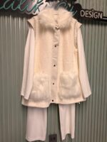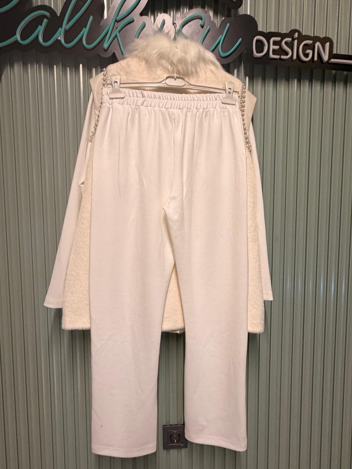 Kürk detaylı yelek, iç üst ve pantolondan oluşan kombin, hem sıcak tutar hem de modern ve güçlü bir görünüm sağlar.