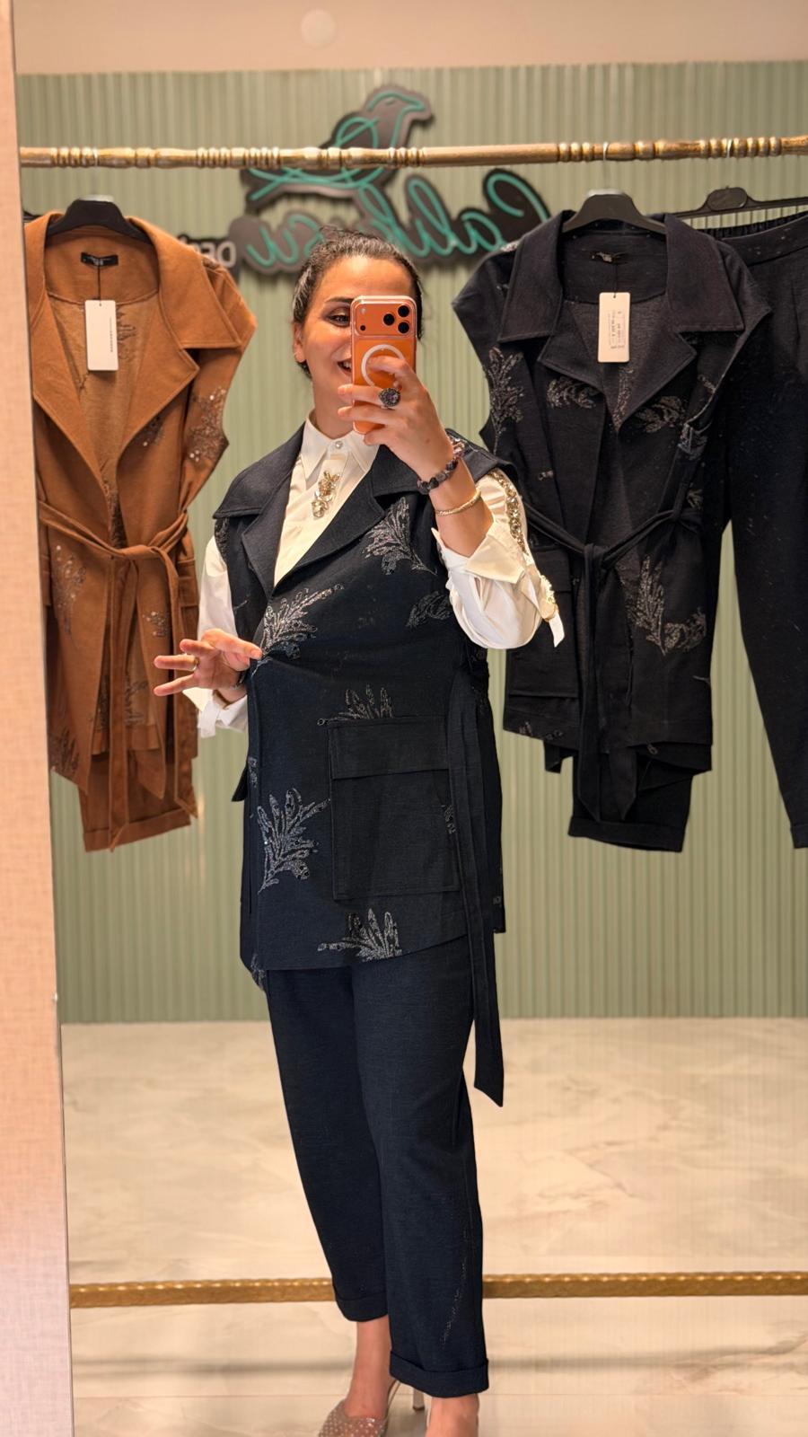 Şıklığı ve zarafeti bir arada sunan bu takım, pul detaylı yeleği ile dikkat çeker.