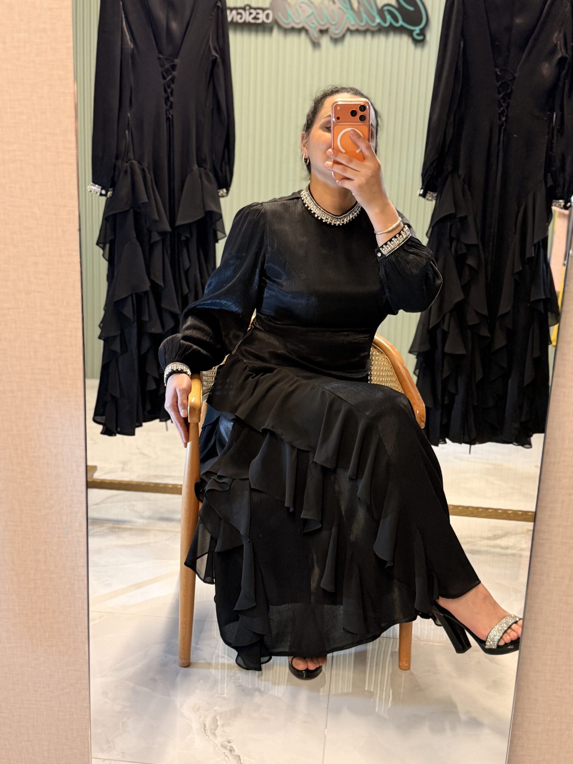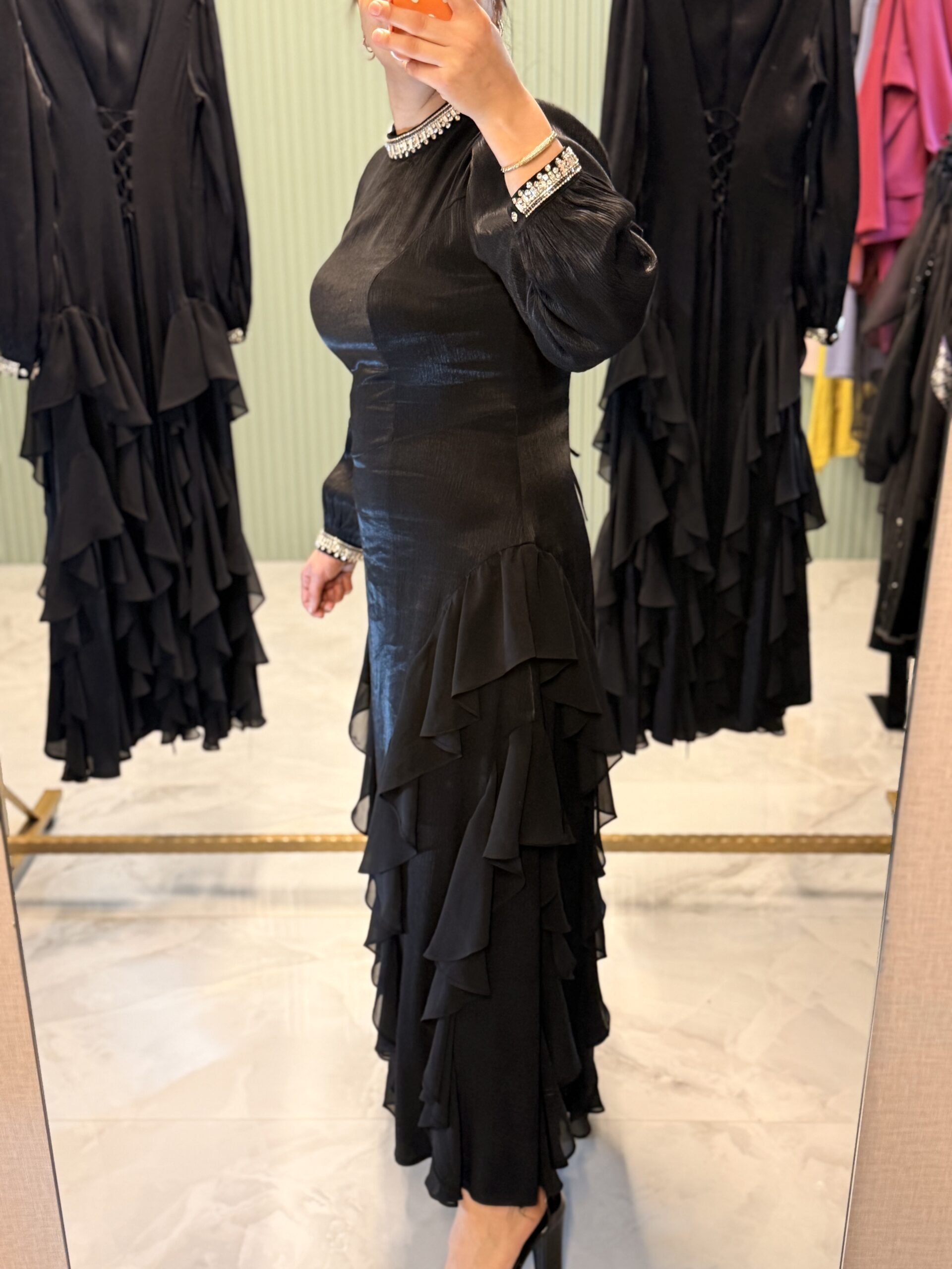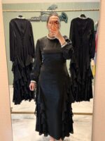 Zarif ve şık tasarımıyla öne çıkan bu özel model, yan kısımlarındaki şifon detaylarıyla hareketli ve akışkan bir görünüm sunar. Özel günlerde ve davetlerde rahatlıkla tercih edebileceğiniz, modern ve şık bir parçadır.